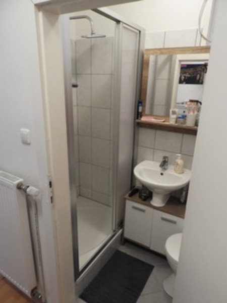 •gute Raumaufteilung: Vorraum, Bad mit Dusche/WC und Tageslicht durch Oberlichtfenster, Wohnzimmer, Küche voll ausgestattet mit Geschirrspüler, Cerankochfeld mit Backrohr und Bar am Fenster, ruhiges Schlafzimmer ausgerichtet in begrünten Innenhof mit sehr großem Einbauschrank, Gasetagenheizung, vorhandener Waschmaschinenanschluss